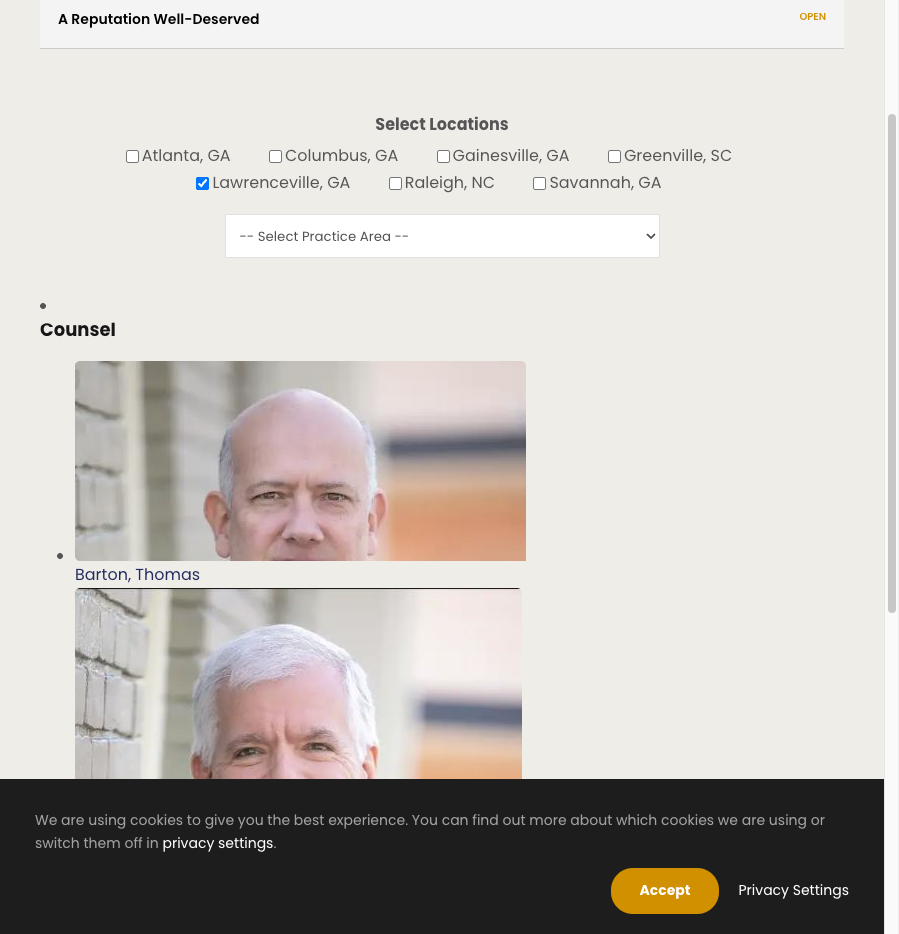 Lawyers are attached to “locations” and “practice areas”. Now when we add a new location (in this case Lawrenceville, GA) the lawyers attached to that location show up in <li> without the parent <ul>