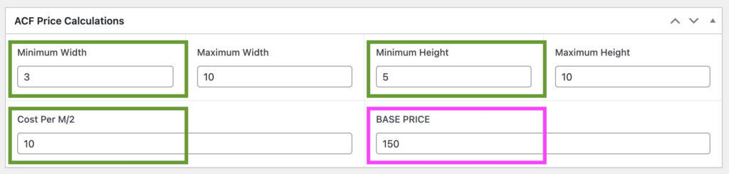 (Minimum Width x Minimum Height) x cost per meter = BASE PRICEThe ACF fields are configured, and we have code snippets plugin installed if required.